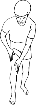 Standing, place one hand on thigh muscle just above knee, inside, and other hand on thigh muscle just below hip, outside. Contract thigh muscles so inside of thigh is tight and outside is relaxed.