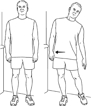Feet shoulder width apart, slowly shift weight over right leg, bending head and trunk slightly to left, left arm hanging out from side. Return to starting position. Shift weight over left leg, bending head and trunk slightly to right, right arm hanging out from side.