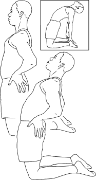 Kneel with hands on buttocks. Arch back. Keep hips in line with thighs. Squeeze buttocks to protect lower back.