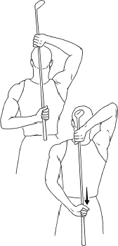 Stand holding club behind body, one arm above head, other arm bent behind back. With lower hand, pull gently downward.