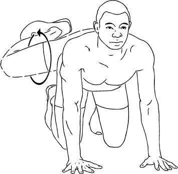 Start in 6-point position. Lift one leg laterally. Thigh parallel to floor, dorsiflex at ankle. Circle bent leg backward away from elbow.