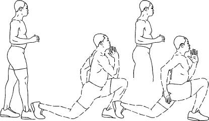Step forward one leg. Drop opposite knee to the floor. Drop from hips. Front shin vertical. Opposite arm forward. Head and chest up. Push from hips and back foot; cycle through