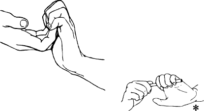 Activity: Without using thumb, curl fingertips around a pen while trying to pull it out with other hand.*
